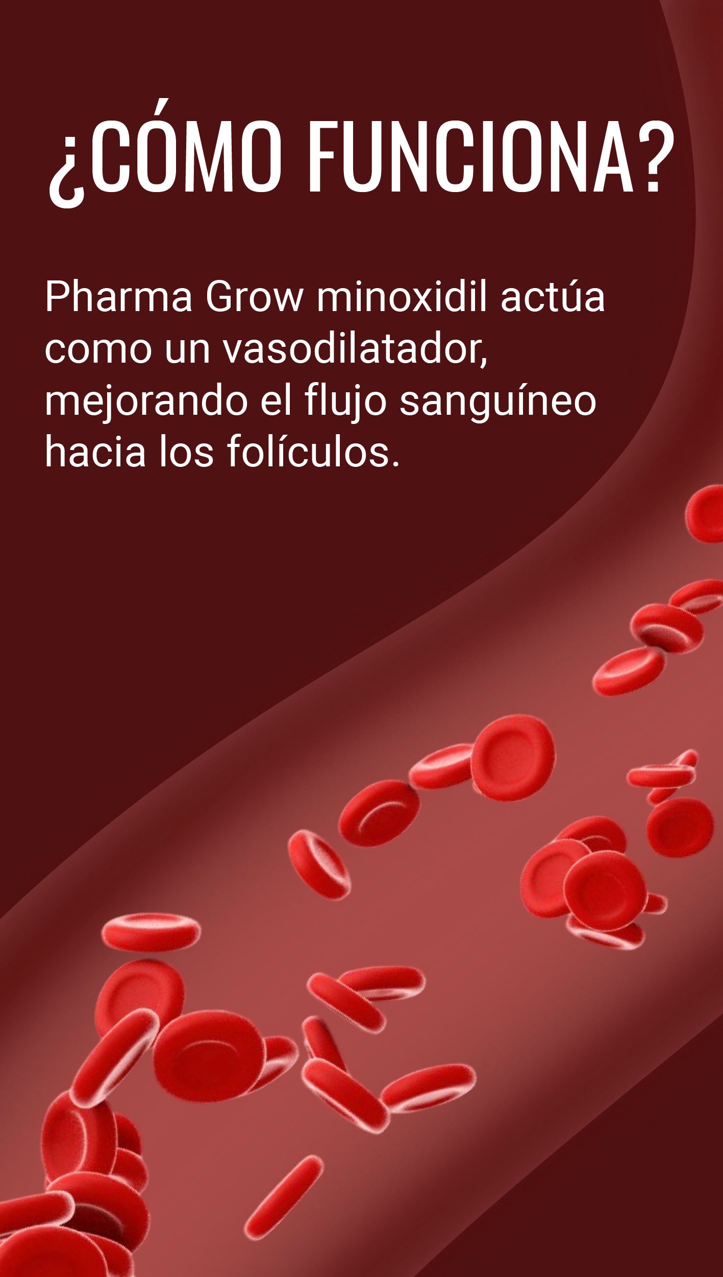 El minoxidil actúa como un vasodilatador, mejorando el flujo sanguíneo hacia los folículos pilosos, lo que prolonga la fase de crecimiento (anágena) del cabello y aumenta la densidad y el grosor de los cabellos nuevos.